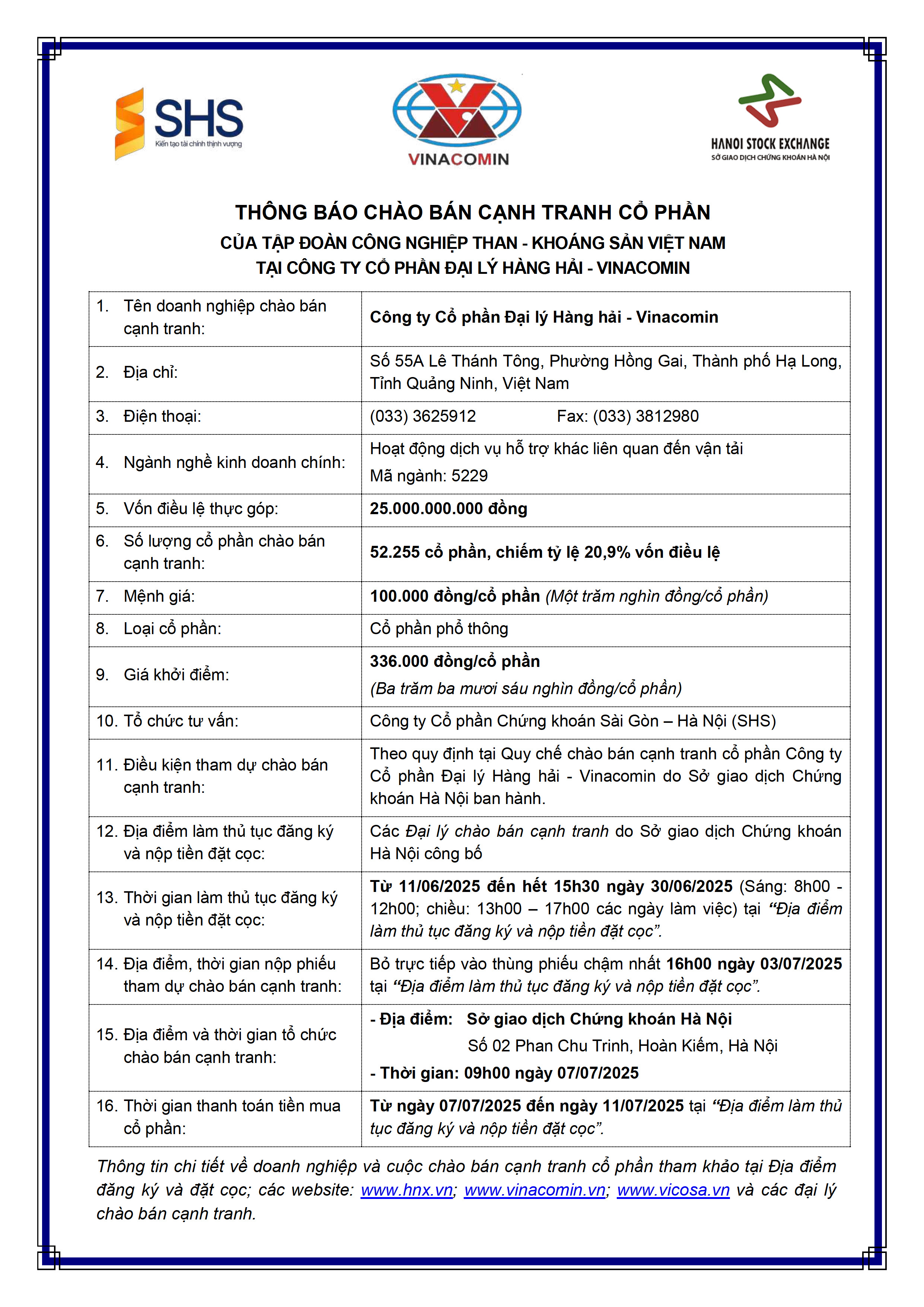 - Thông báo chào bán cạnh tranh cổ phần Công ty Cổ phần Đại lý Hàng hải - Vinacomin - 11/06/2025