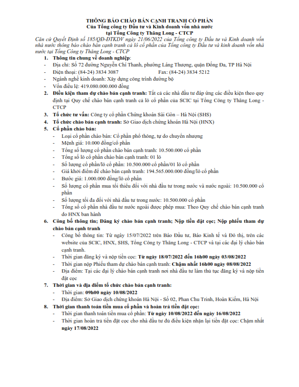 - Thông báo bán đấu giá cp của Tổng Công ty Thăng Long - CTCP do Tổng Công ty đầu tư kinh doanh vốn nhà nuớc sở hữu - 18/07/2022