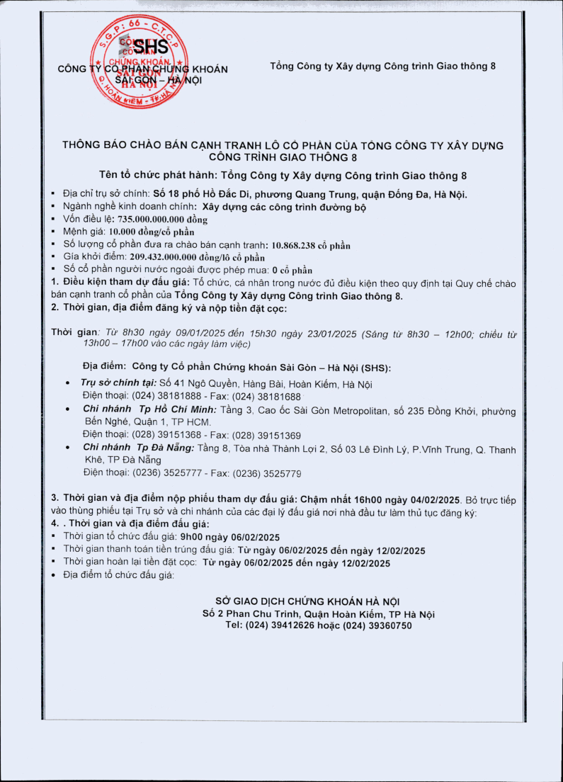 Thông báo Chào bán Cạnh tranh lô cổ phần Tổng Công ty Xây dựng Công trình giao thông 8