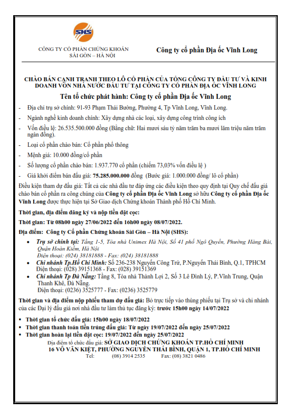 Thông báo chào bán cạnh tranh theo lô cổ phần của TCT Đầu tư và kinh doanh vốn nhà nước đầu tư tại CTCP Địa ốc Vĩnh Long