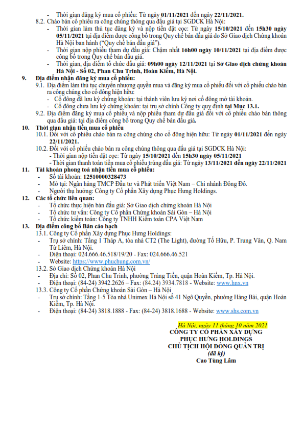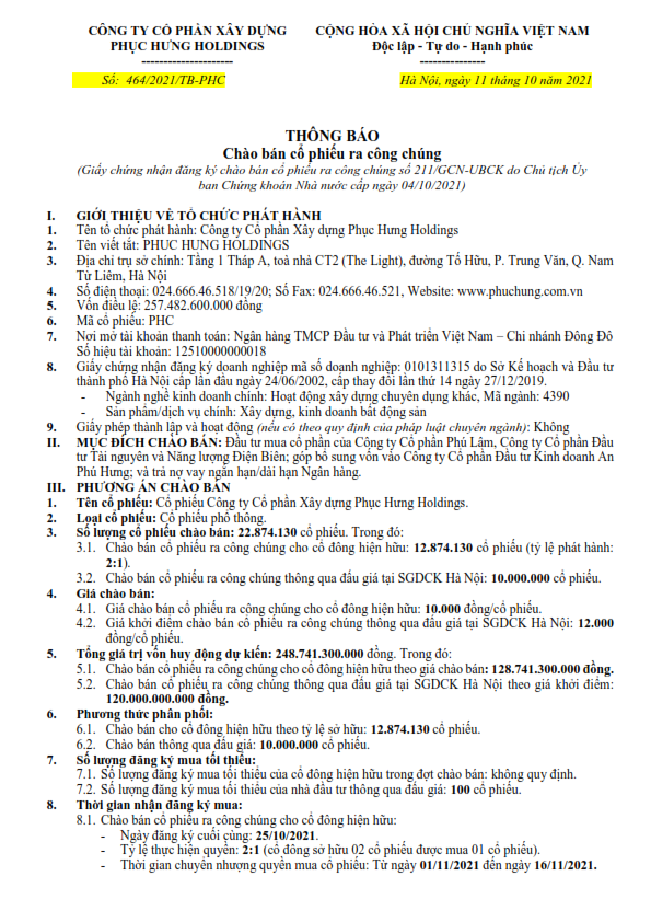Thông báo chào bán cổ phiếu ra công chúng của CTCP Phục Hưng Holdings