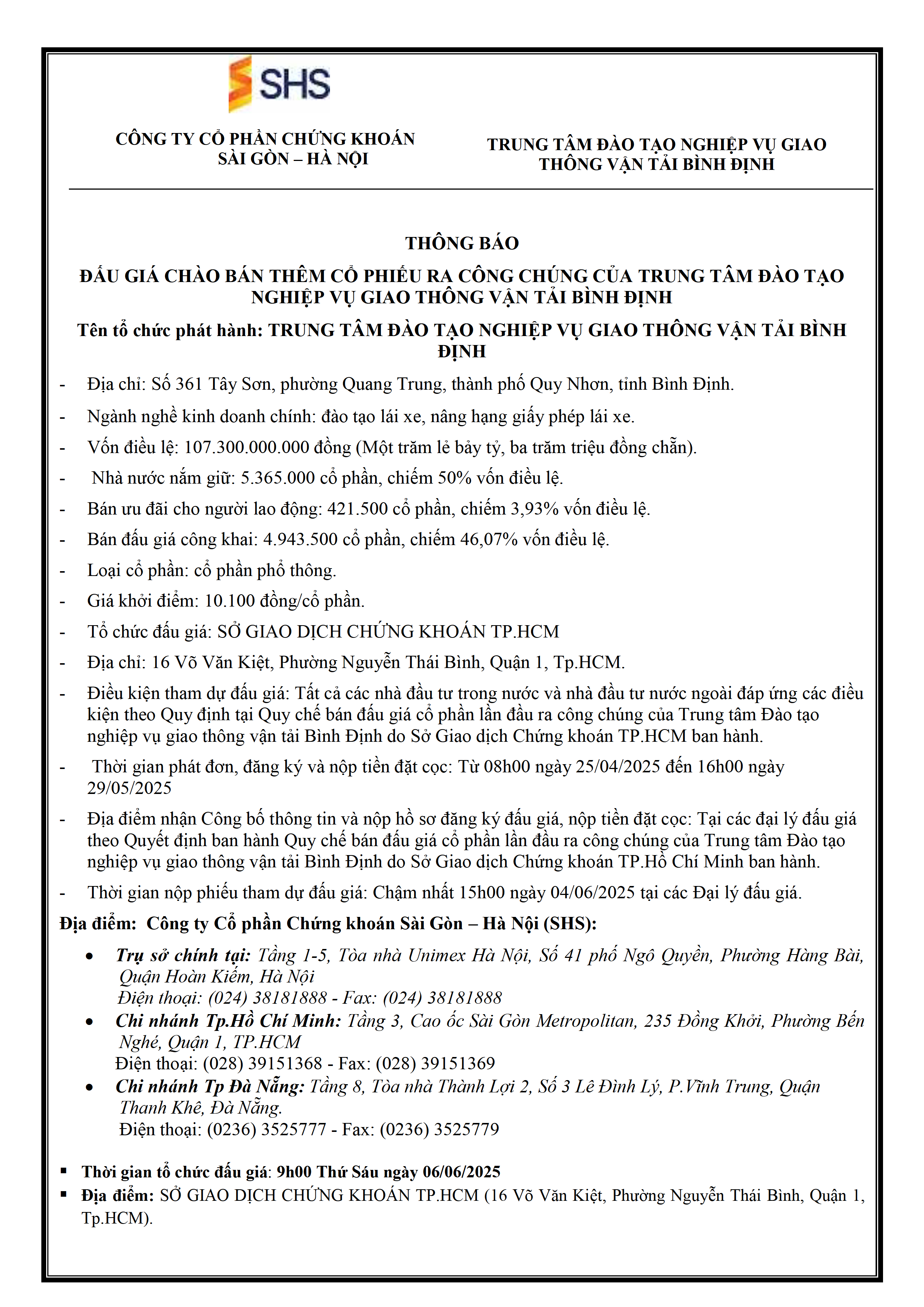 Thông báo Chào bán đấu giá theo lô cổ phần TRUNG TÂM ĐÀO TẠO NGHIỆP VỤ GIAO THÔNG VẬN TẢI BÌNH ĐỊNH