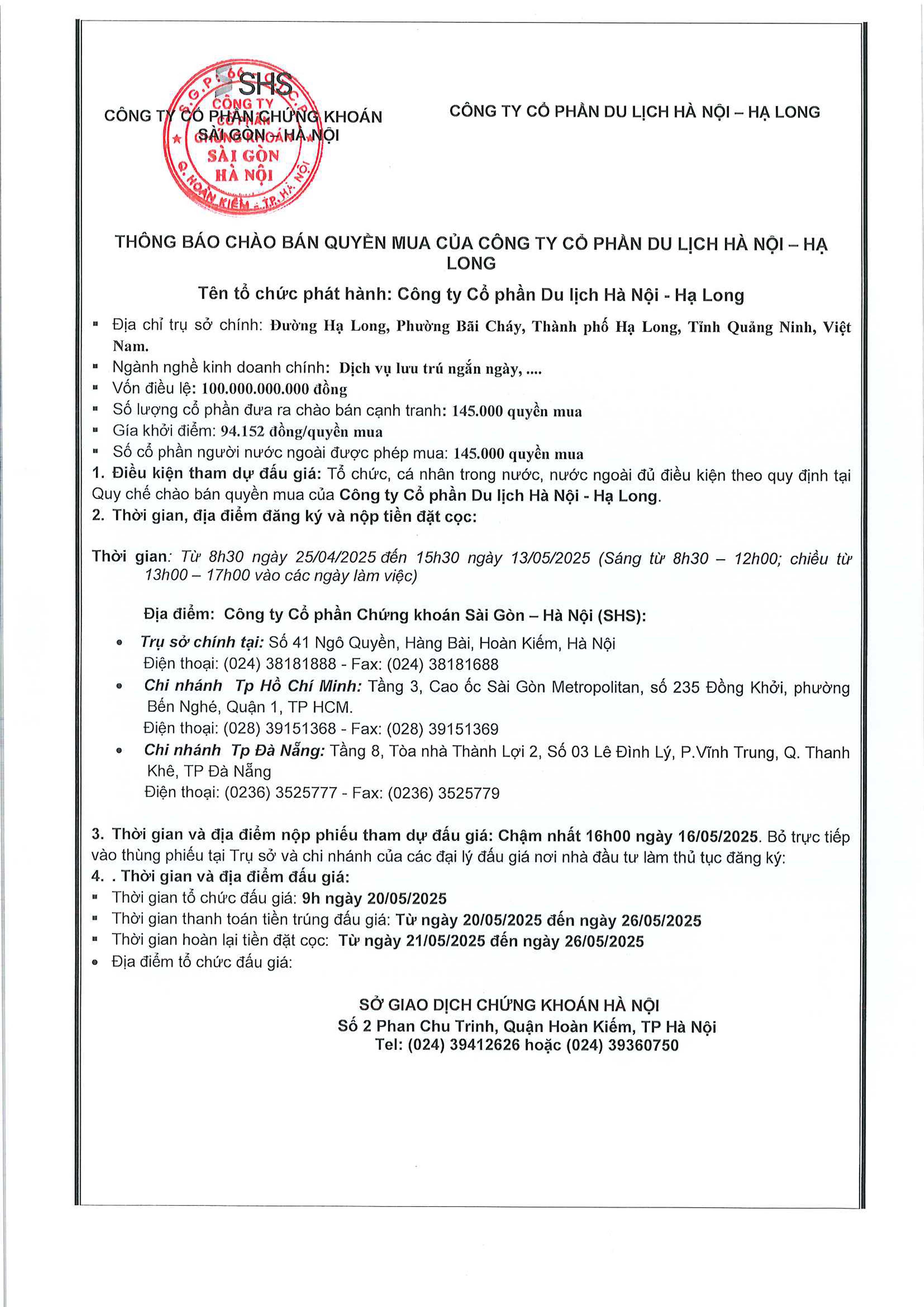 - Thông báo chào bán cổ phần của Công ty Cổ phần Du lịch Hà Nội - Hạ Long - 26/04/2025