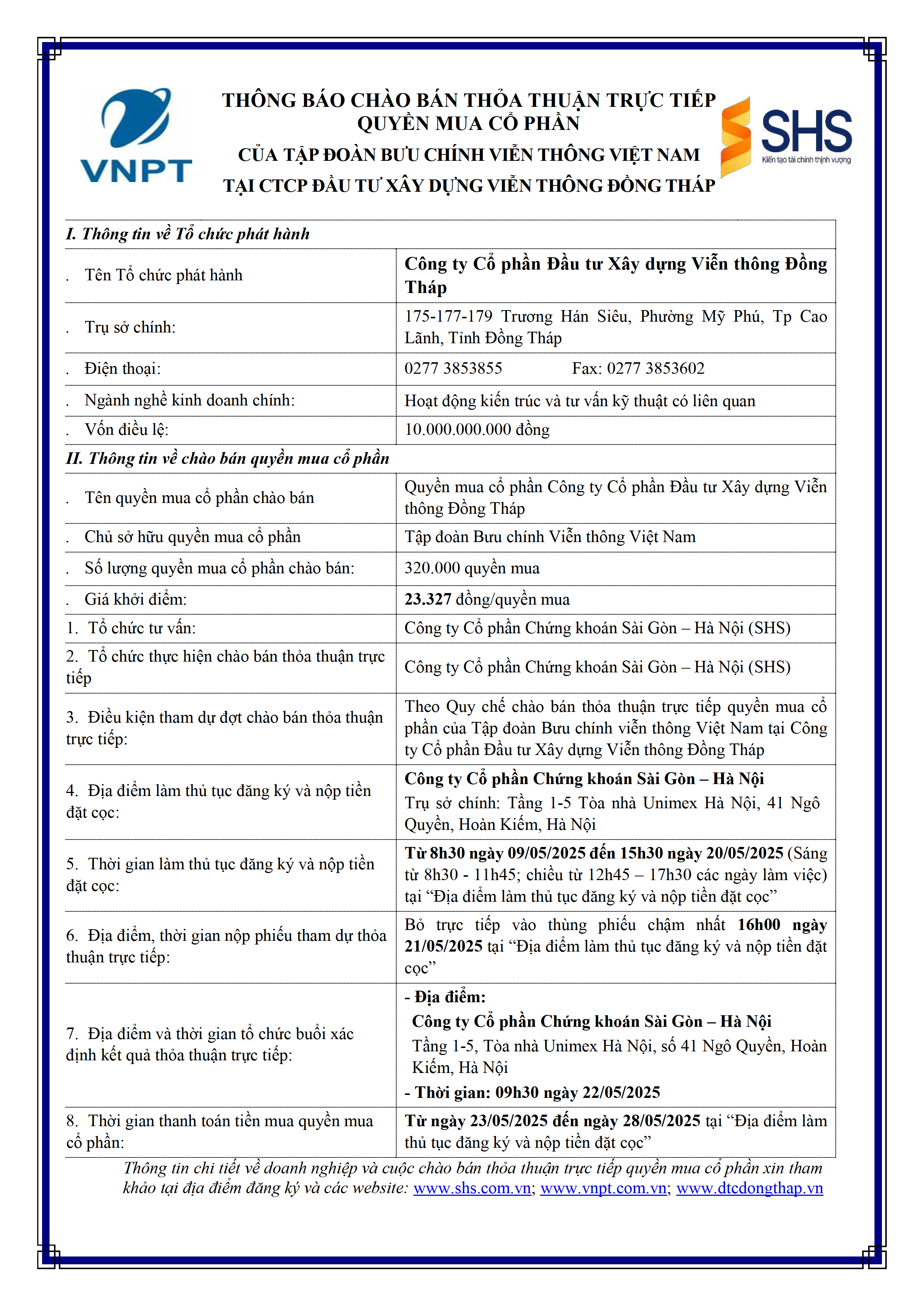 Thông báo Chào bán thỏa thuận trực tiếp quyền mua cổ phần của Tập đoàn Bưu chính Viễn thông Việt Nam tại Công ty Cổ phần Đầu tư Xây dựng Viễn thông Đồng Tháp