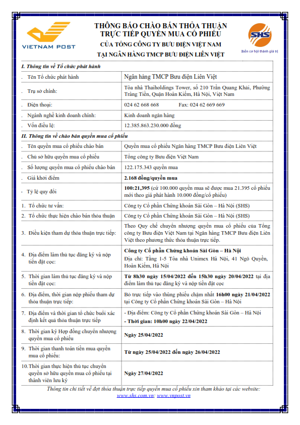 Thông báo chào bán thỏa thuận trực tiếp quyền mua cổ phiếu của Tổng công ty Bưu điện Việt Nam tại Ngân hàng TMCP Bưu điện Liên Việt