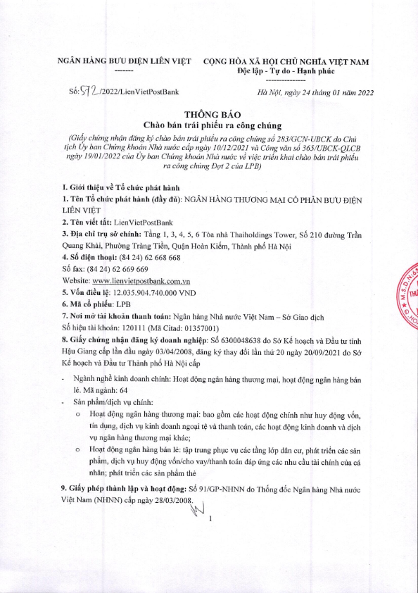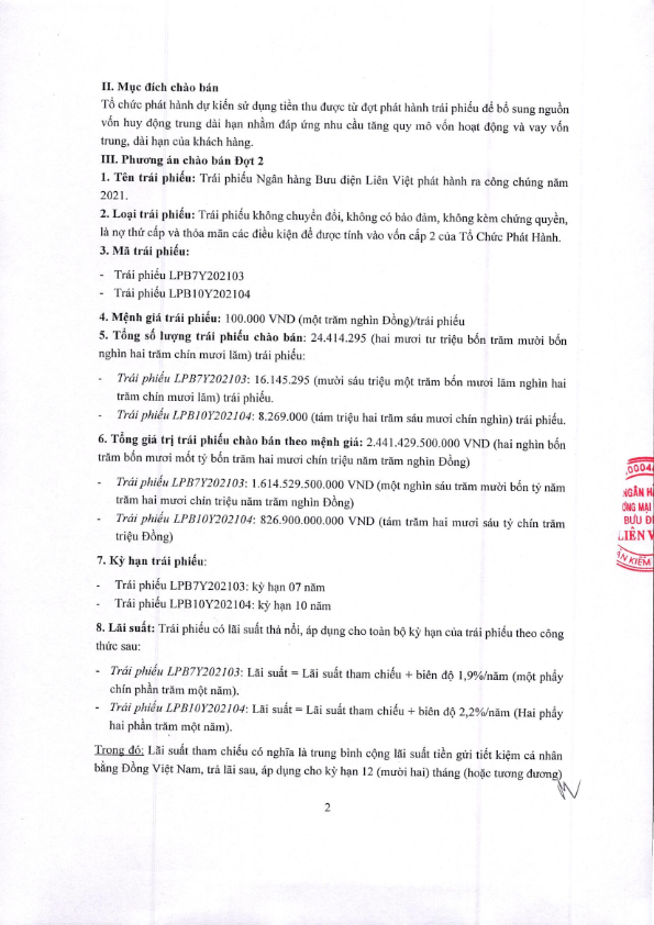 Thông báo chào bán Trái phiếu Ngân hàng TMCP Bưu điện Liên Việt phát hành ra công chúng năm 2021 Đợt 2