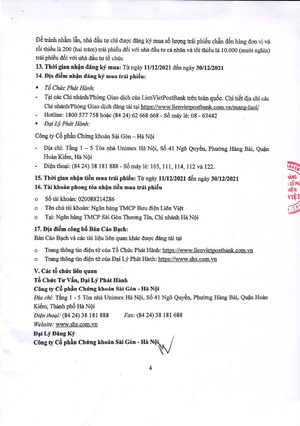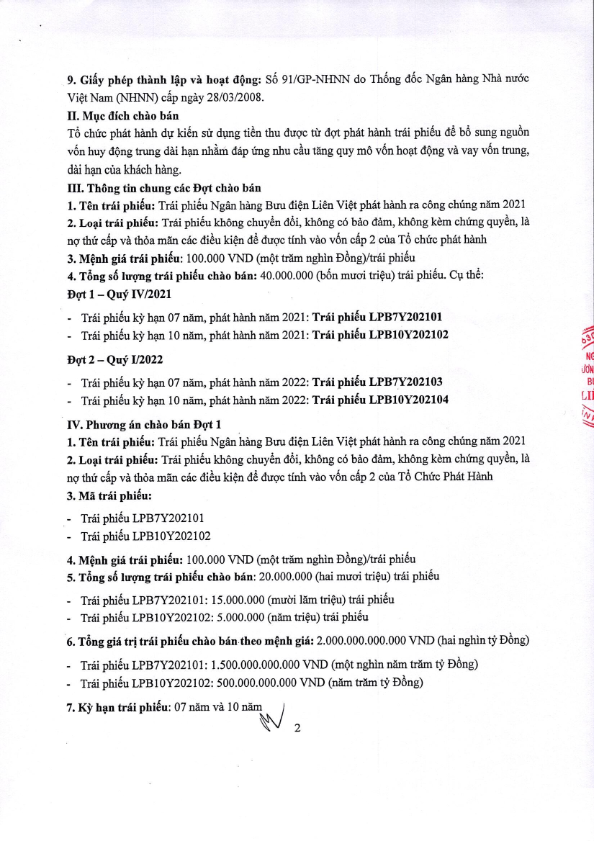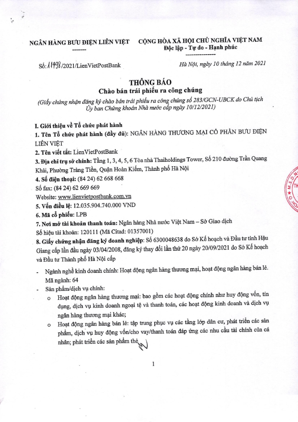 Thông báo chào bán Trái Phiếu Ngân hàng TMCP Bưu điện Liên Việt ra công chúng năm 2021