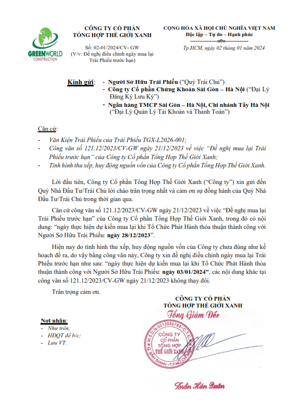 Thông báo của TCPH về việc thay đổi ngày mua lại trước hạn Trái phiếu TGX-L2026-001