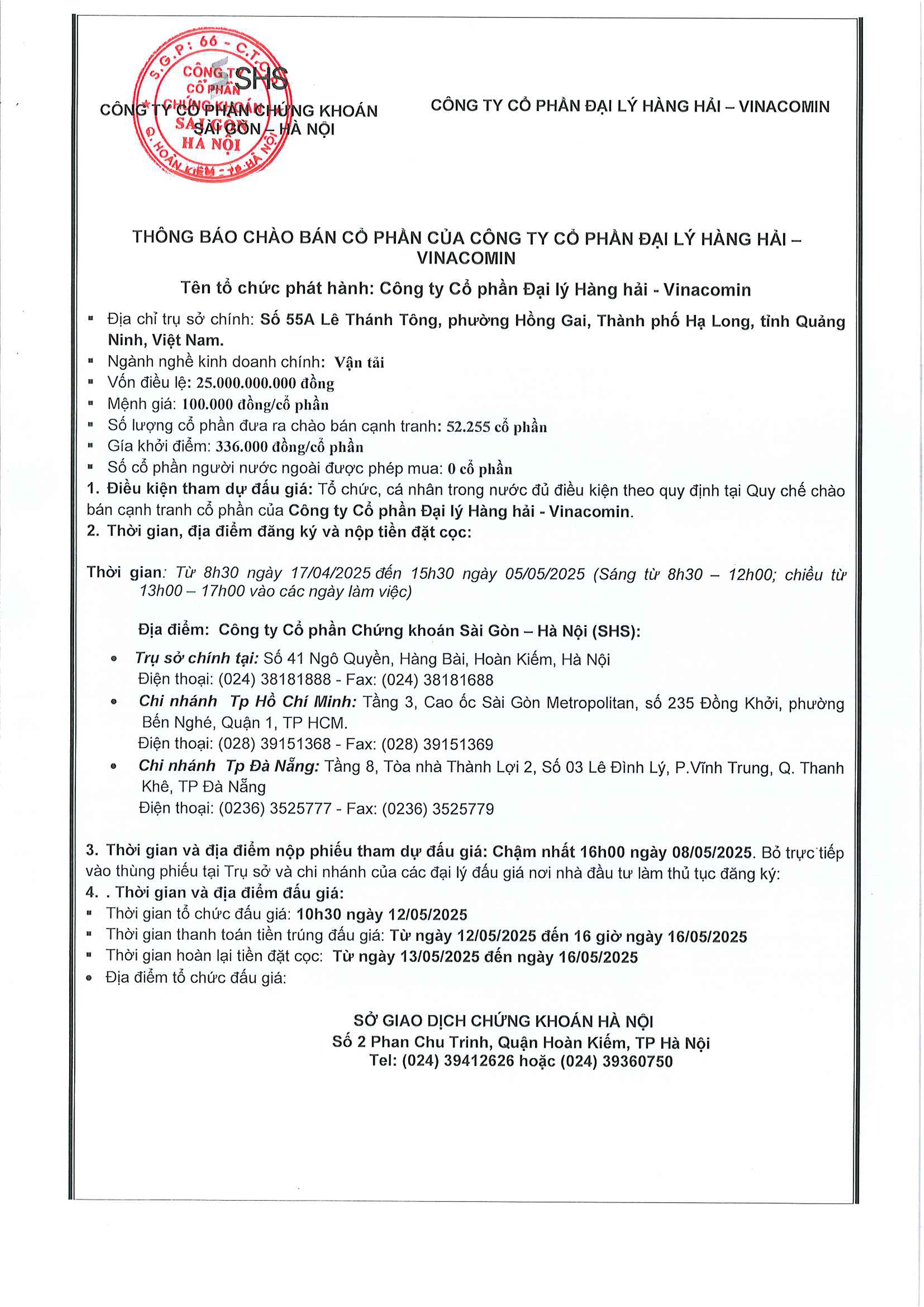 - Thông báo bán đấu giá cổ phần CTCP Đại lý Hàng hải – Vinacomin thuộc sở hữu của Tập đoàn Công nghiệp Than – Khoáng sản Việt Nam - 16/04/2025