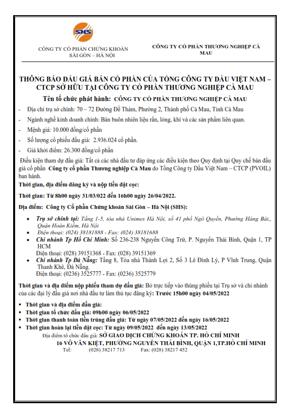 Thông báo đấu giá bán cổ phần của Tổng công ty Dầu Việt Nam - CTCP sở hữu tại CTCP Thương nghiệp Cà Mau