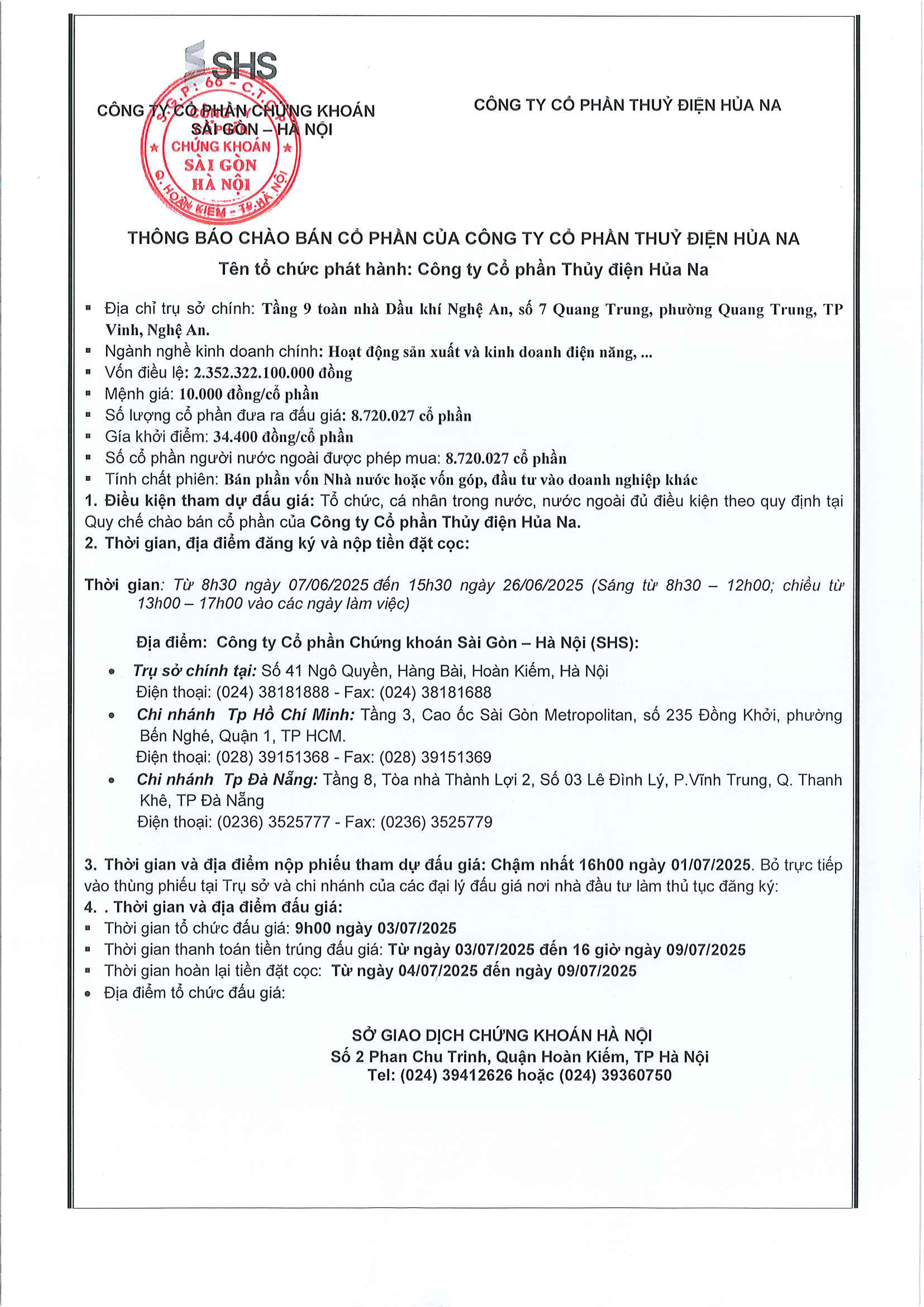 Thông báo đấu giá cổ phần Công ty Cổ phần Thủy điện Hủa Na