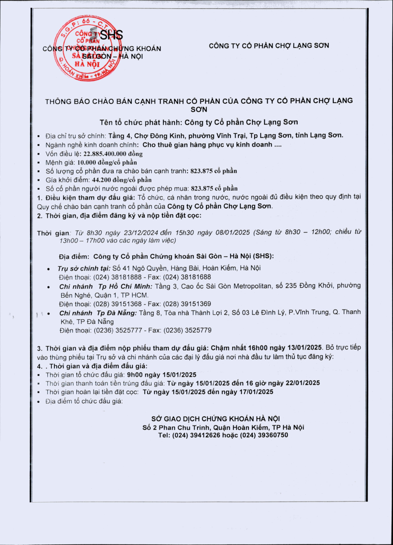 Thông báo đấu giá Công ty Cổ phần Chợ Lạng Sơn