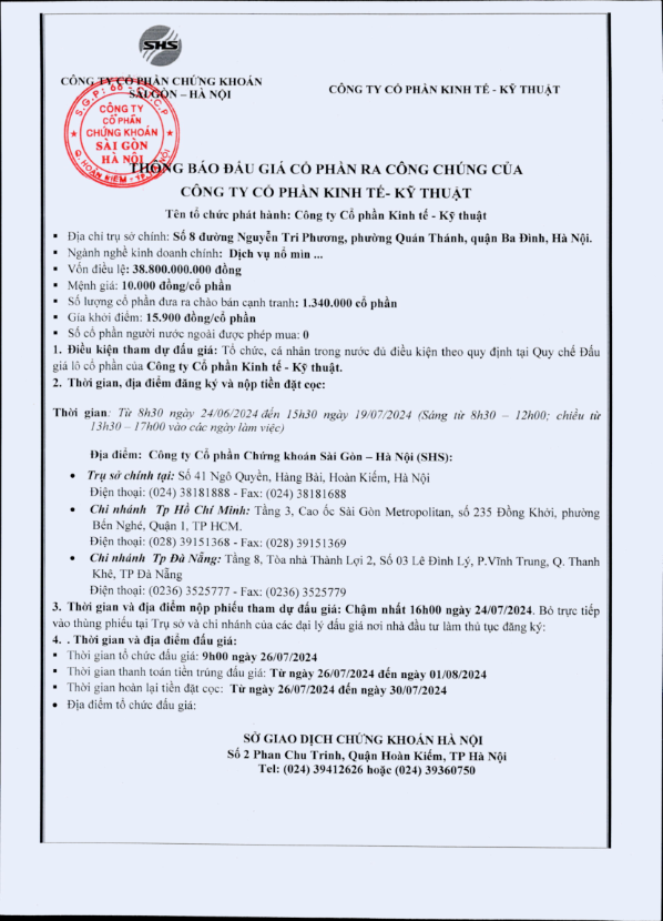 Thông báo đấu giá Công ty Cổ phần Kinh tế-Kỹ thuật