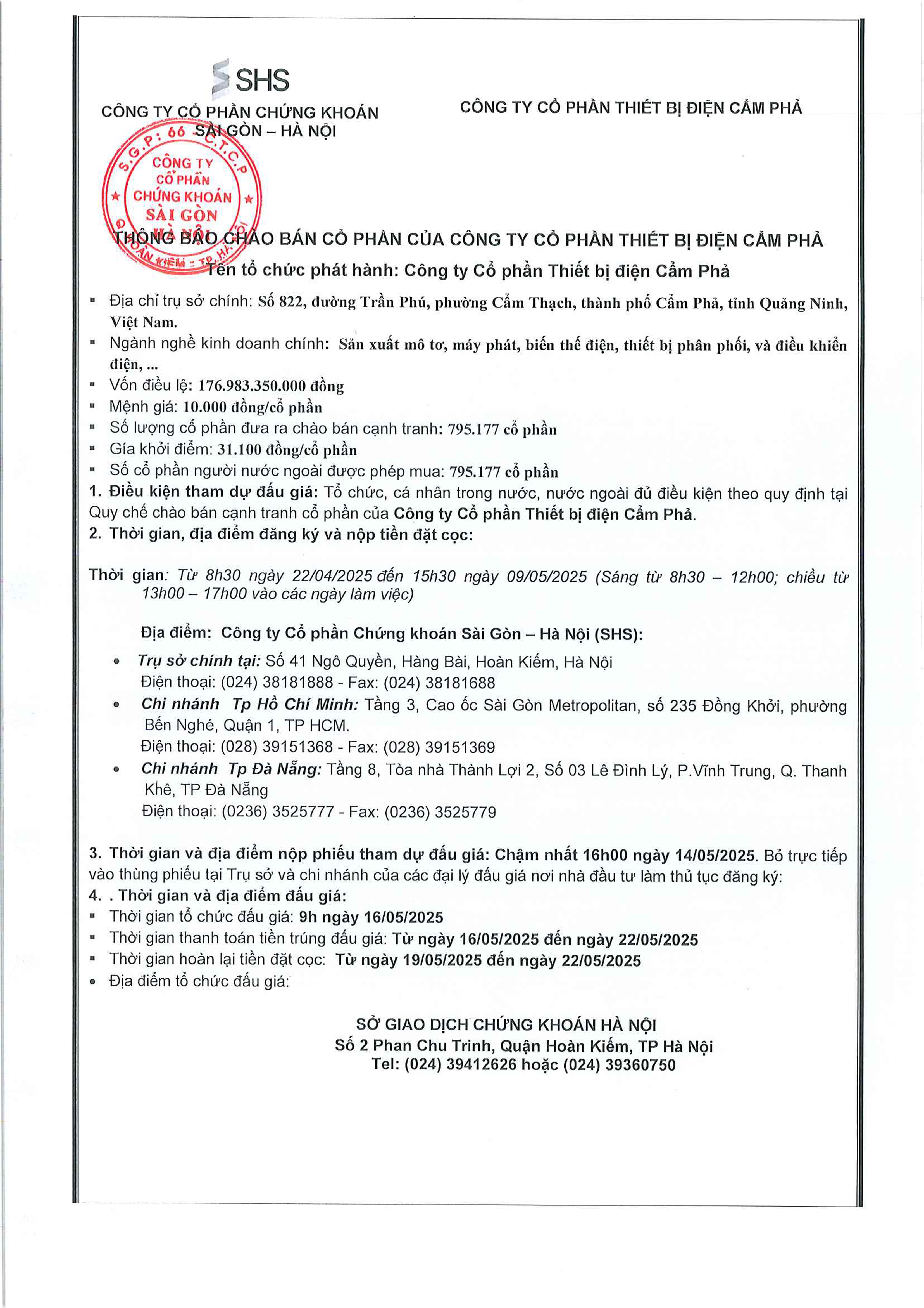 - Thông báo bán đấu giá cổ phần CTCP Thiết bị điện Cẩm Phả thuộc sở hữu của Tập đoàn Công nghiệp Than – Khoáng sản Việt Nam - 21/04/2025