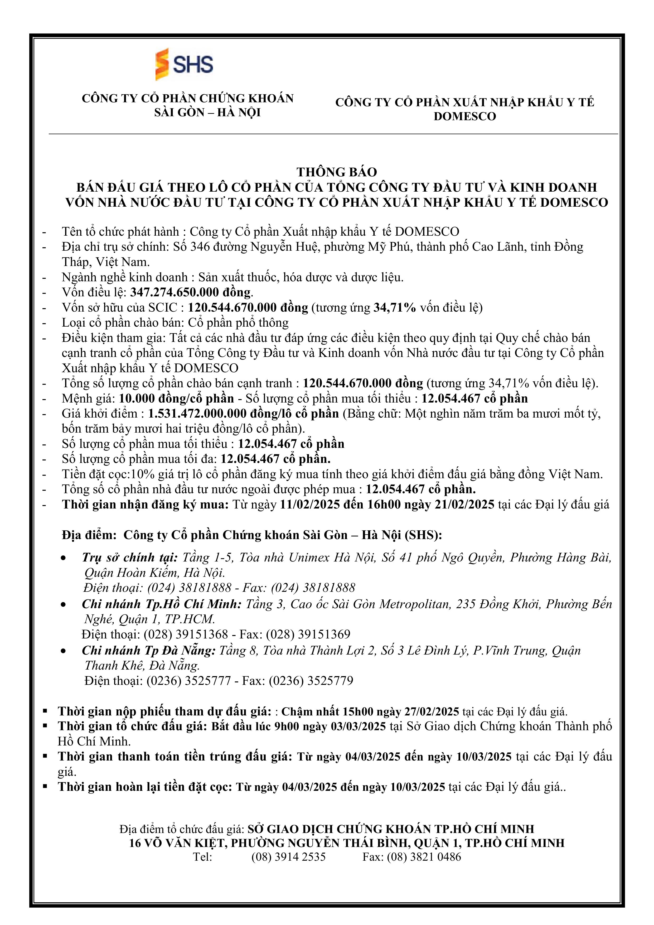 Thông báo Đấu giá theo lô cổ phần Công ty Cổ phần Xuất Nhập Khẩu Y tế Domesco