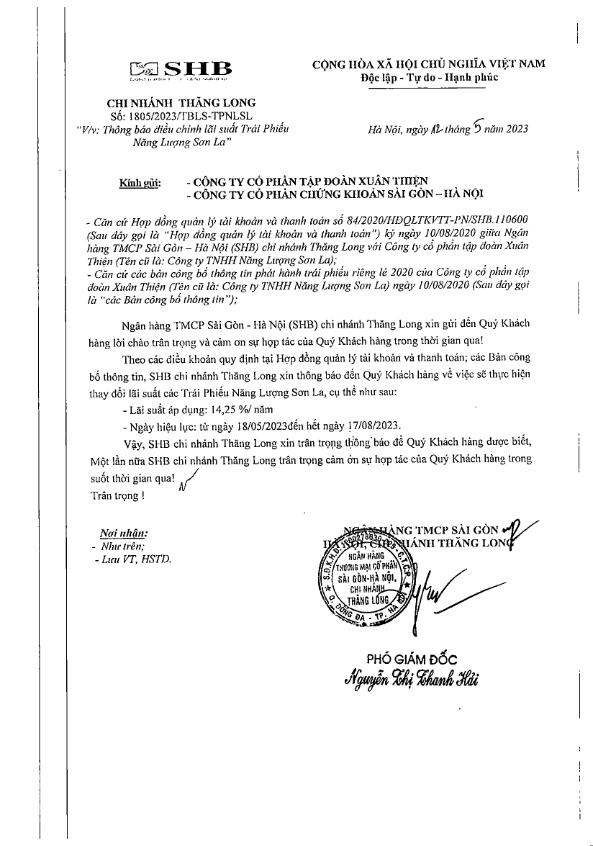 Thông báo điều chỉnh lãi suất Trái phiếu Công ty Cổ phần Tập đoàn Xuân Thiện (NLSL)