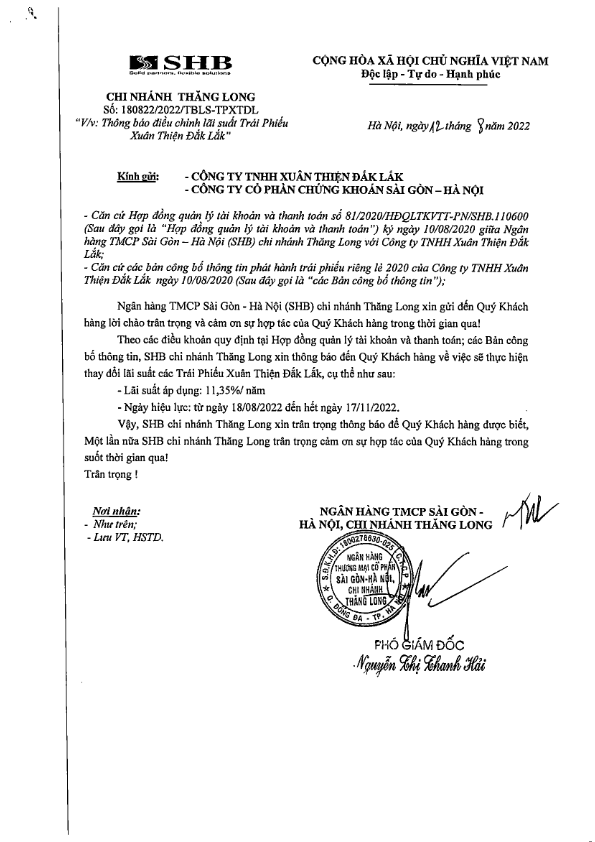 Thông báo điều chỉnh lãi suất Trái phiếu Công ty TNHH Xuân Thiện Đắk Lắk