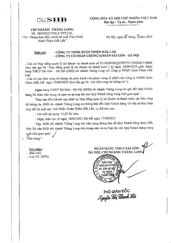Thông báo điều chỉnh lãi suất Trái phiếu Công ty TNHH Xuân Thiện Đắk Lắk. (XTDL)