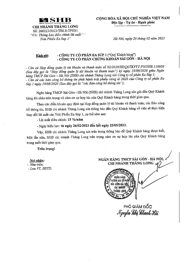 - Thông báo điều chỉnh lãi suất Trái phiếu CTCP Ea Súp 3 - 27/02/2023