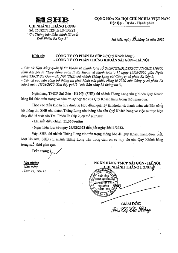 - Thông báo điều chỉnh lãi suất Trái phiếu CTCP Ea Súp 1 - 18/08/2022