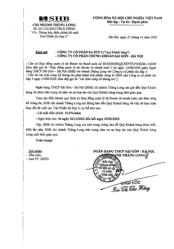 Thông báo điều chỉnh lãi suất Trái phiếu CTCP Ea Súp 3
