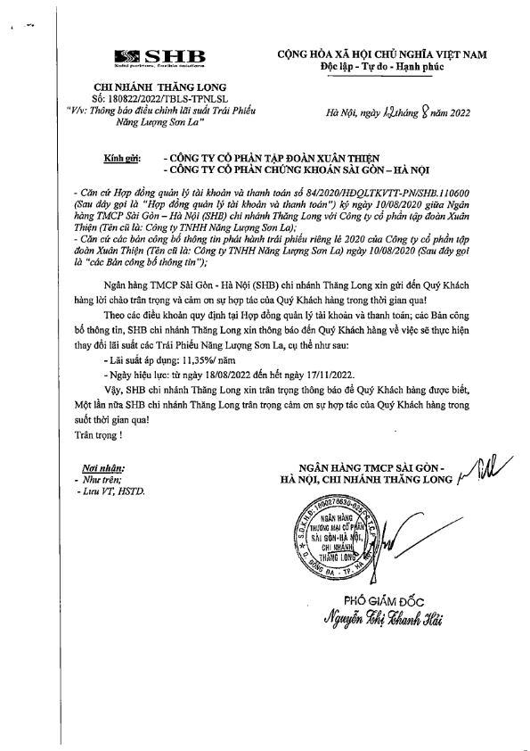 Thông báo điều chỉnh lãi suất Trái phiếu CTCP Tập đoàn Xuân Thiện