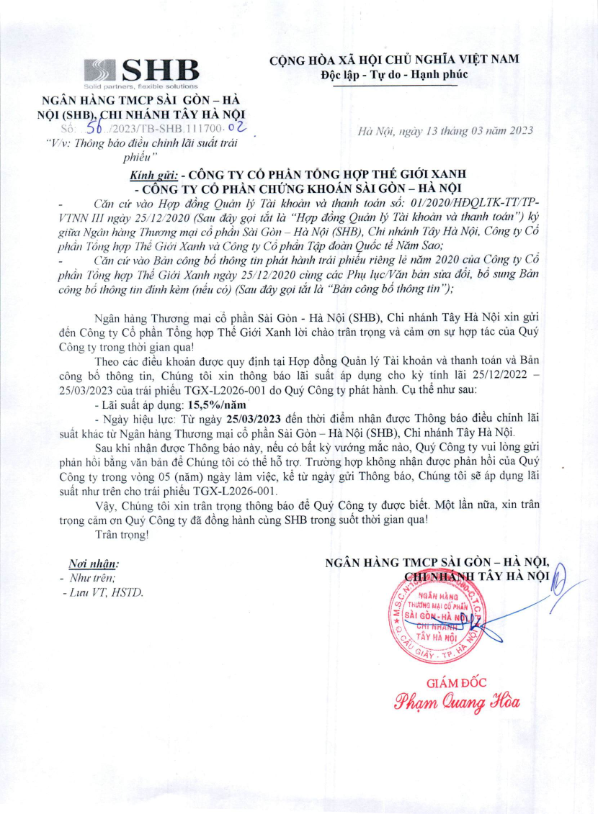Thông báo điều chỉnh lãi suất Trái phiếu CTCP Tổng hợp Thế giới Xanh
