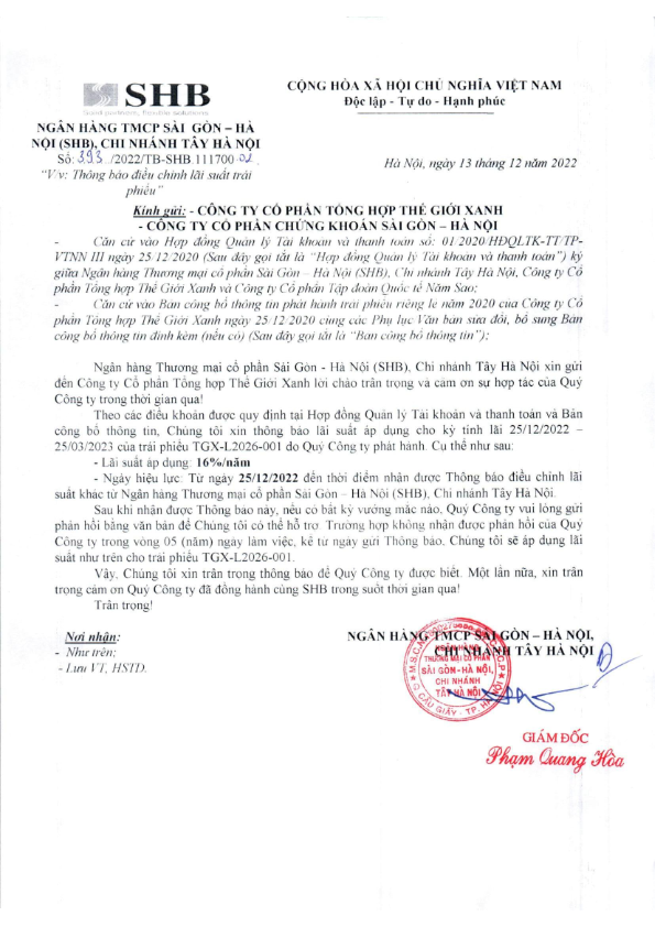 Thông báo điều chỉnh lãi suất Trái phiếu CTCP Tổng hợp Thế giới Xanh