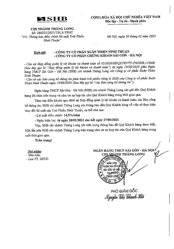Thông báo điều chỉnh lãi suất Trái phiếu CTCP Xuân Thiện Ninh Thuận