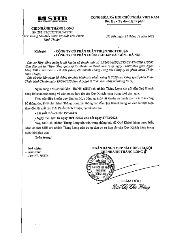- Thông báo điều chỉnh lãi suất Trái phiếu CTCP Xuân Thiện Thuận Bắc - 20/11/2022