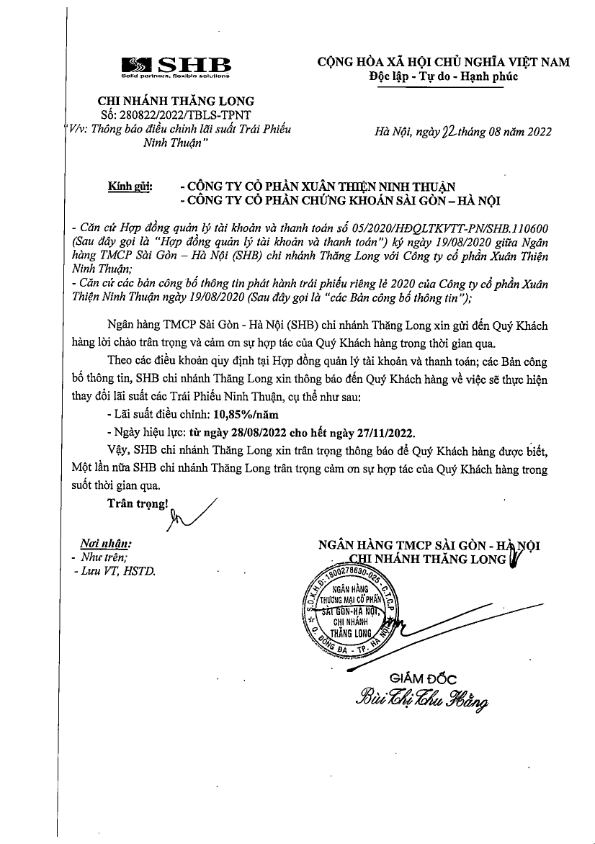 Thông báo điều chỉnh lãi suất Trái phiếu CTCP Xuân Thiện Ninh Thuận