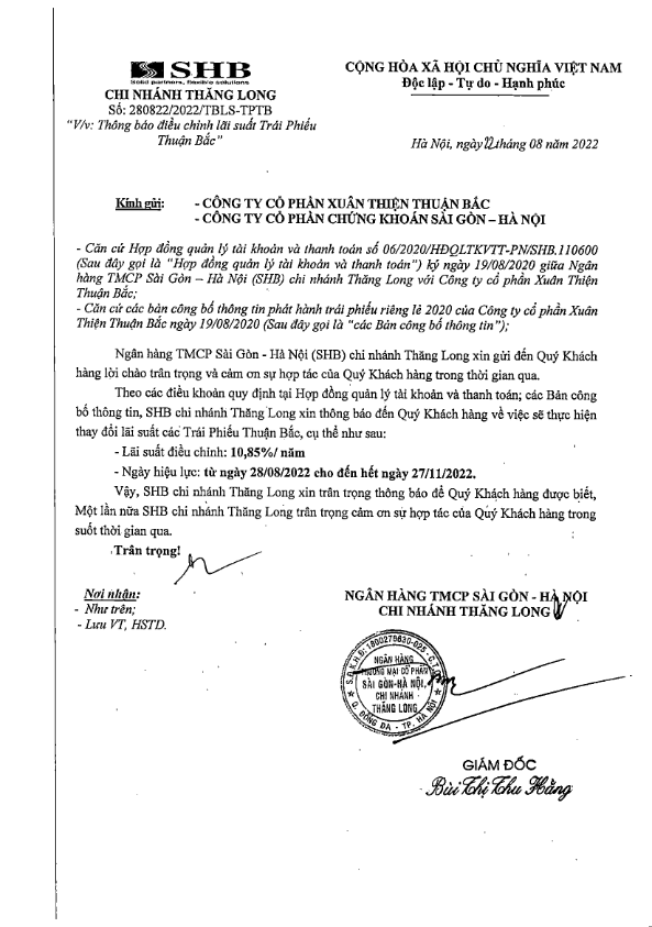 Thông báo điều chỉnh lãi suất Trái phiếu CTCP Xuân Thiện Thuận Bắc