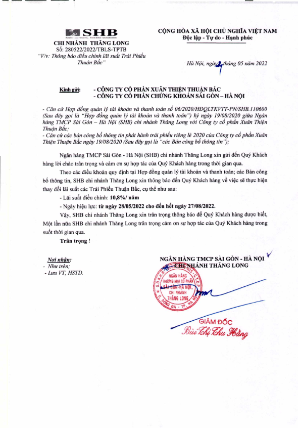 Thông báo điều chỉnh lãi suất Trái phiếu CTCP Xuân Thiện Thuận Bắc