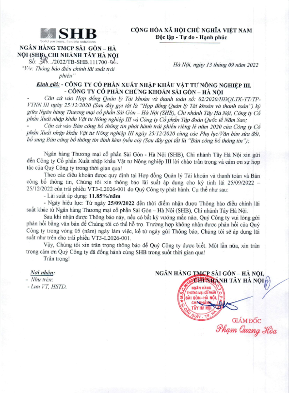 Thông báo điều chỉnh lãi suất Trái phiếu VT3 CTCP Xuất nhập khẩu Vật tư nông ngiệp III