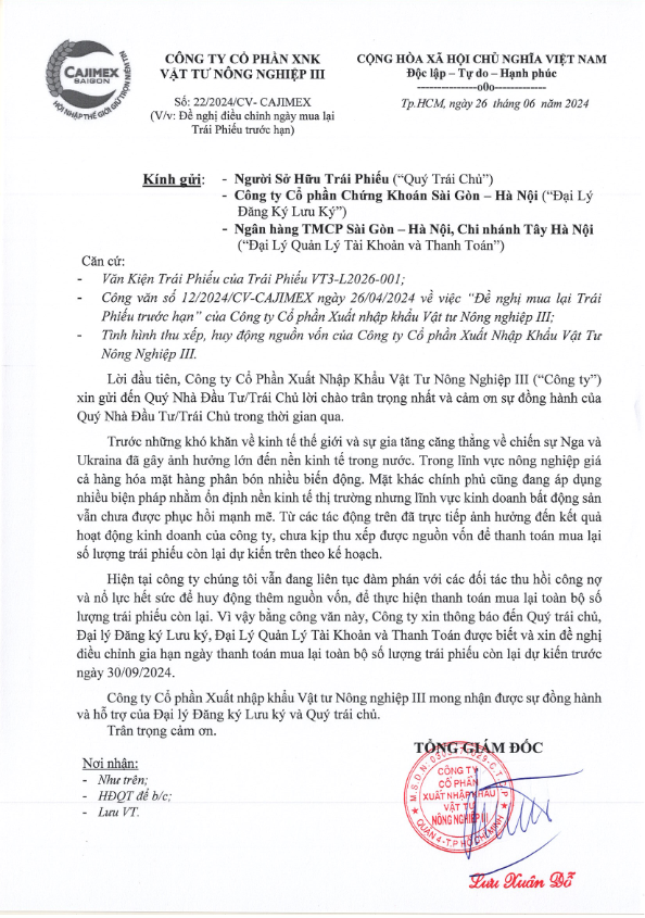 - Thông báo điều chinh ngày chốt trả lãi Trái phiếu CTCP Xuất nhập khẩu Vật tư Nông nghiệp III - 26/06/2024