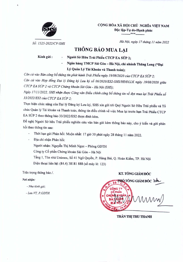 - Thông báo Đề Nghị mua lại trước hạn Trái Phiếu CTCP Ea súp 2 - 16/11/2022