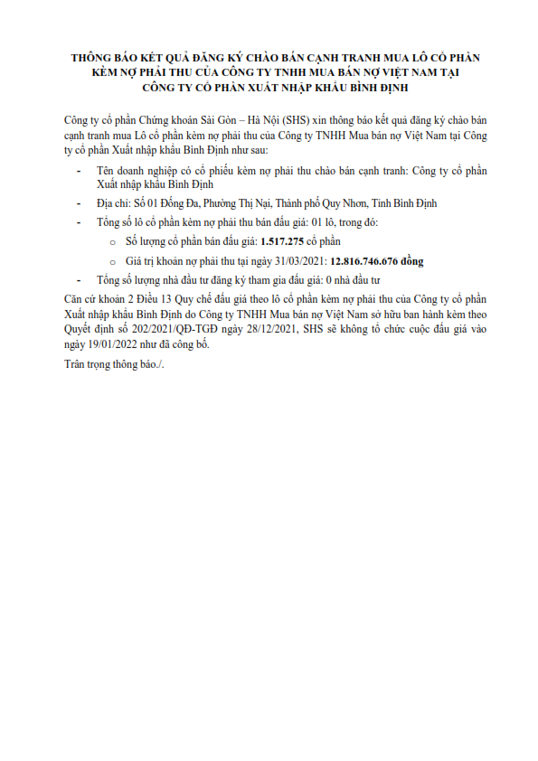 Thông báo kết quả đăng ký chào bán cạnh tranh mua Lô cổ phần kèm nợ phải thu của Công ty TNHH Mua bán nợ Việt Nam tại Công ty cổ phần Xuất nhập khẩu Bình Định