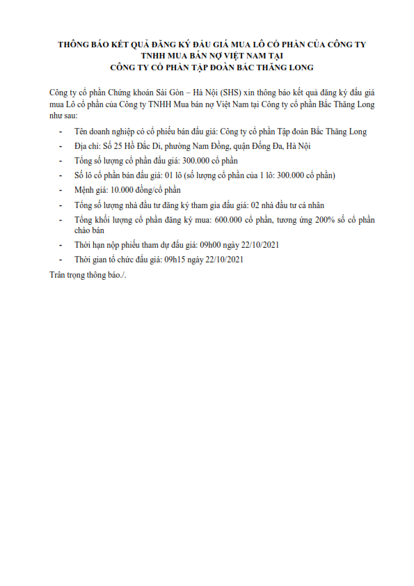 Thông báo kết quả đăng ký đấu giá mua lô cổ phần của Công ty TNHH Mua bán nợ Việt Nam tại CTCP Tập đoàn Bắc Thăng Long