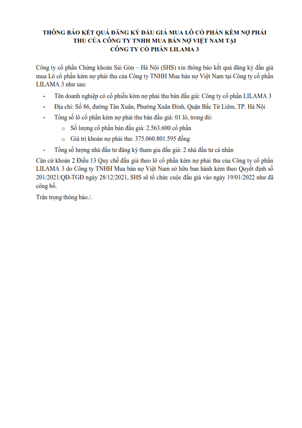 Thông báo kết quả đăng ký đấu giá mua Lô cổ phần kèm nợ phải thu của Công ty TNHH Mua bán nợ Việt Nam tại Công ty cổ phần LILAMA 3
