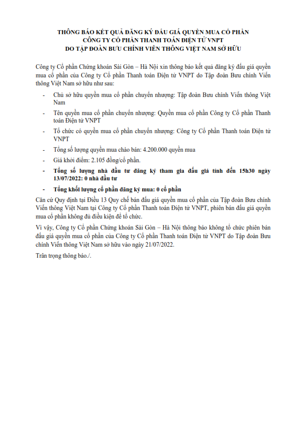 Thông báo kết quả đăng ký đấu giá quyền mua cổ phần CTCP Thanh toán điện tử VNPT do Tập đoàn Bưu chính viễn thông Việt Nam sở hữu