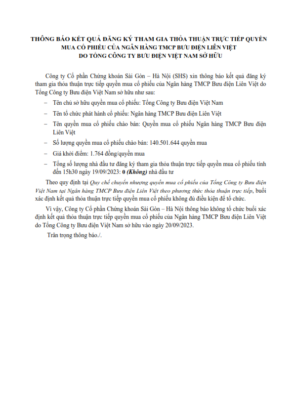 - Thông báo chào bán thỏa thuận trực tiếp quyền mua cổ phiếu của Tổng công ty Bưu điện Việt Nam tại Ngân hàng TMCP Bưu điện Liên Việt - 13/09/2023