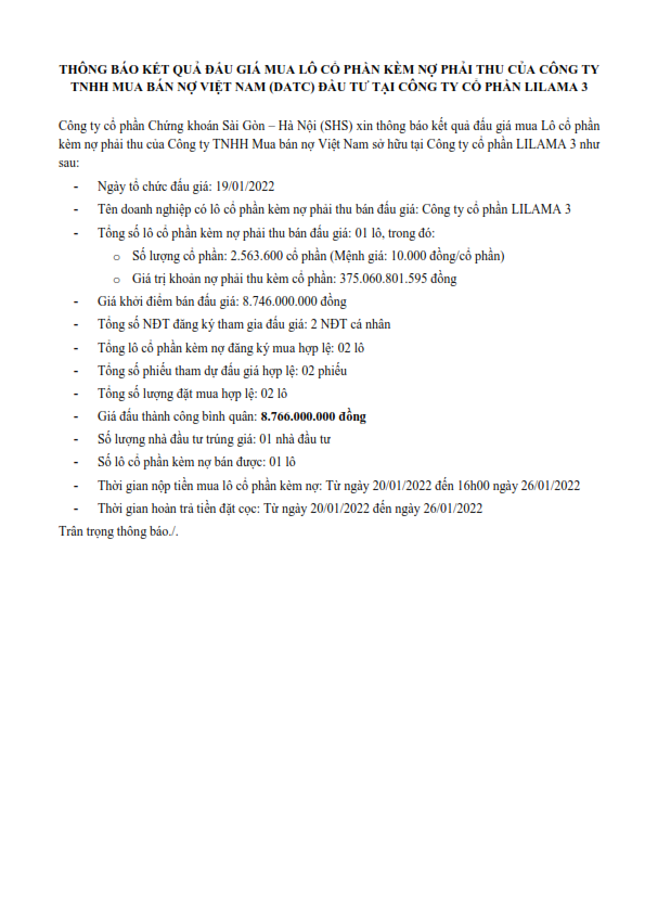 Thông báo kết quả đấu giá mua Lô cổ phần kèm nợ phải thu của Công ty TNHH Mua bán nợ Việt Nam sở hữu tại Công ty cổ phần LILAMA 3