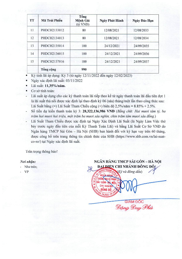 Thông báo lãi suất kỳ 3 - Trái phiếu CTY TNHH Điện Gió Phước Hữu – Duyên Hải 1
