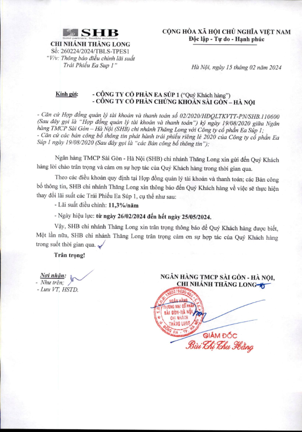 - Thông báo v/v Mua lại trước hạn Trái phiếu CTCP Ea Súp 3 - 21/02/2024