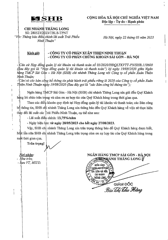 Thông báo lãi suất kỳ mới từ ngày 28/05/2023-28/08/2023 TP Công ty Cổ Phần Xuân Thiện Ninh Thuận