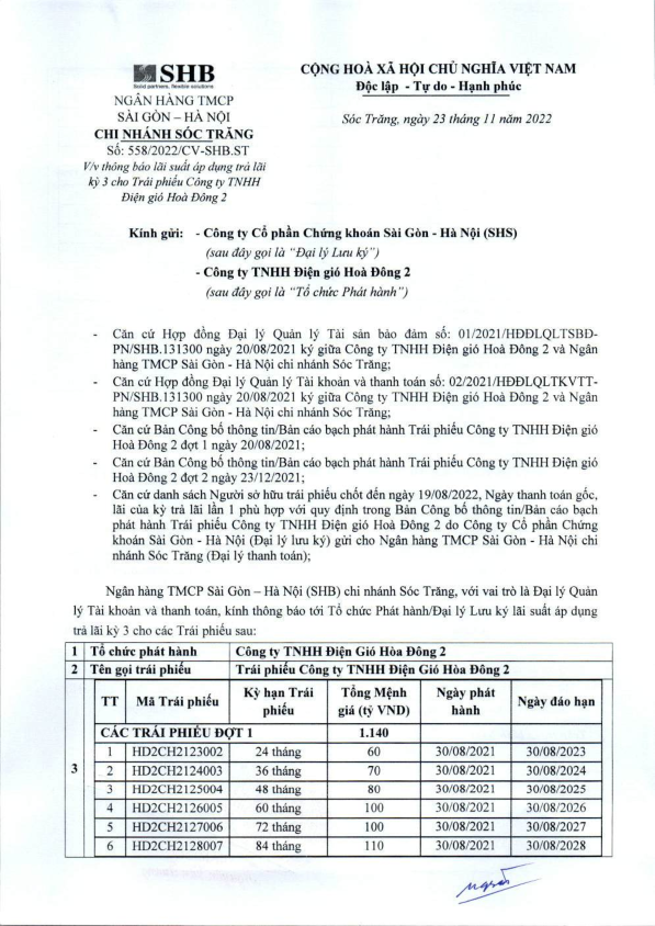 Thông báo lãi suất kỳ tiếp theo đố với Trái phiếu CTY TNHH Điện Gió Hoà Đông 2