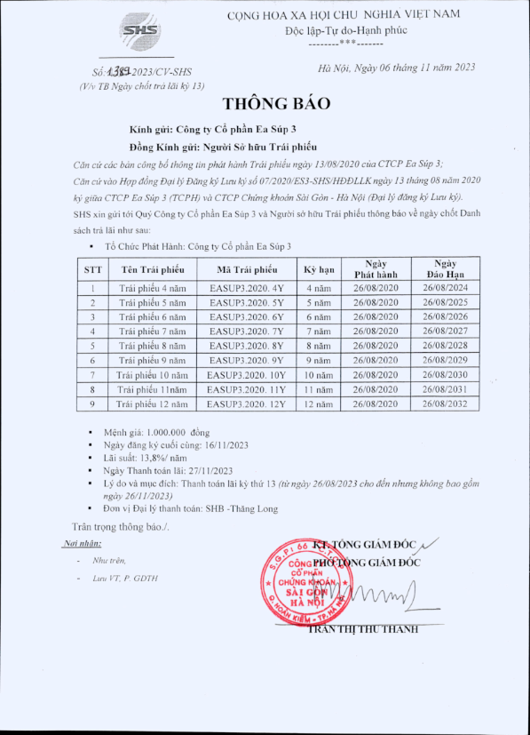 Thông báo lãi suất Trái phiếu Công ty Cổ phần EA SÚP 3