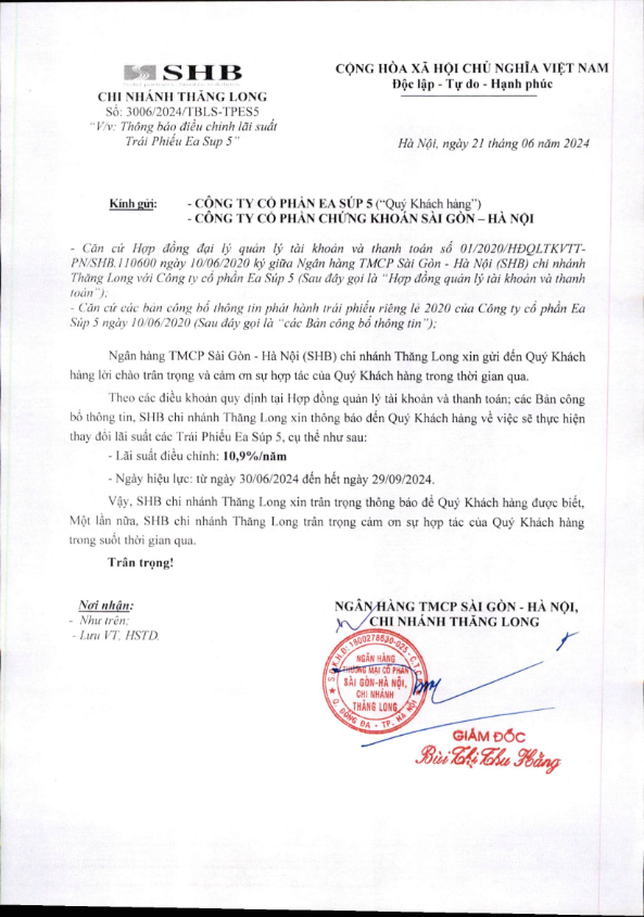 Thông báo lãi suất trái phiếu Công ty cổ phần EA súp 5