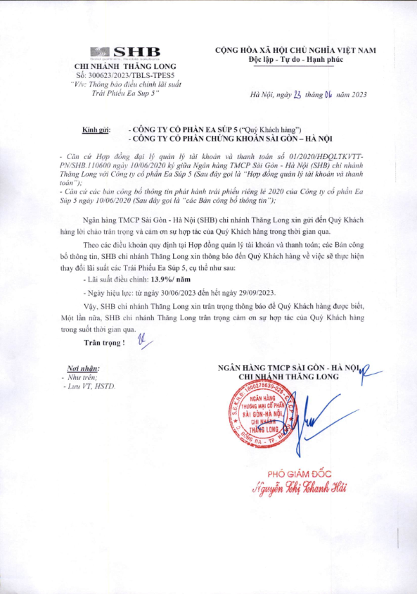 - Thông báo v/v mua lại trước hạn theo yêu cầu của CTCP Ea Súp 5 - 04/07/2023