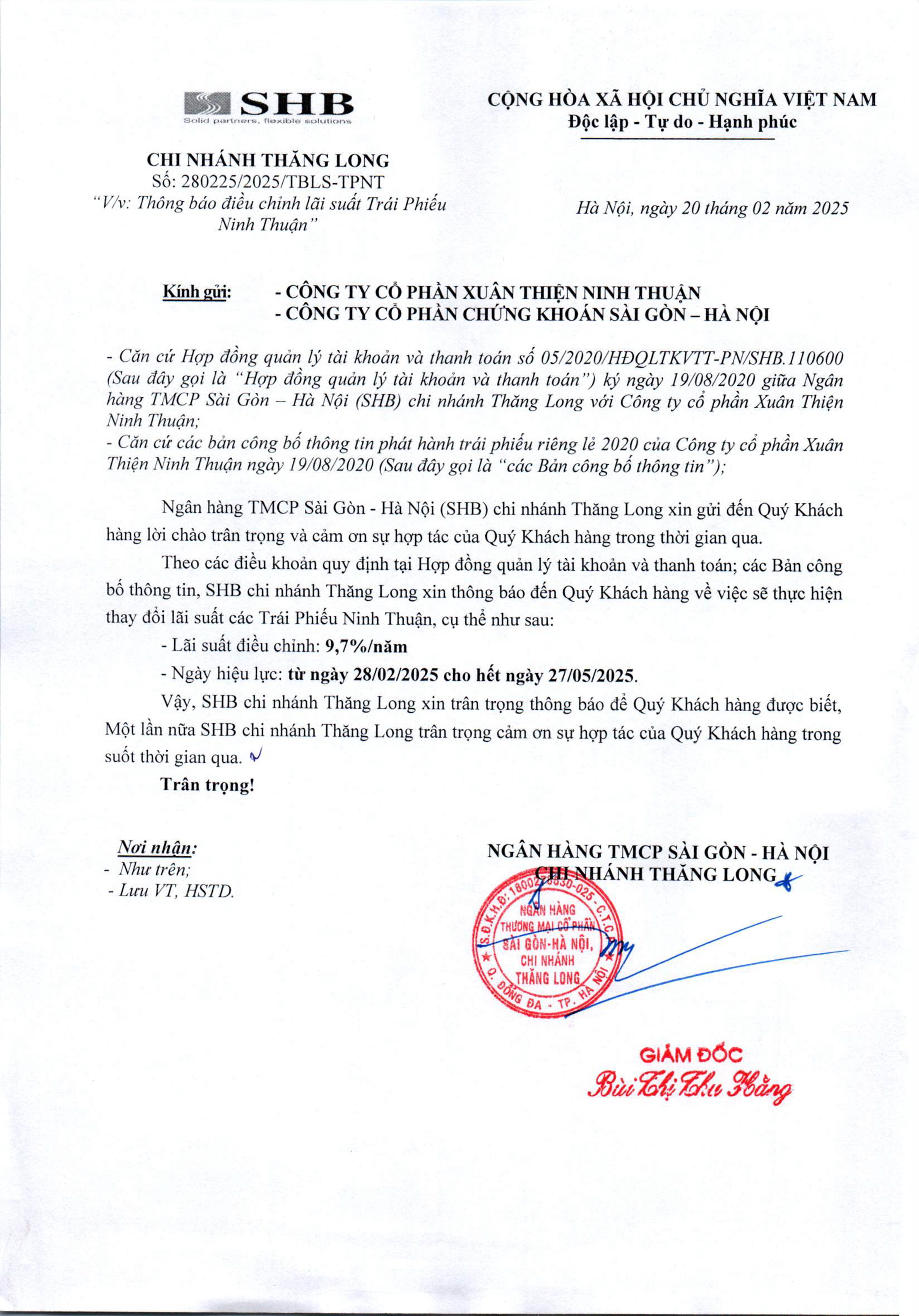 Thông báo lãi suất trái phiếu Công ty Cổ Phần Xuân Thiện Ninh Thuận